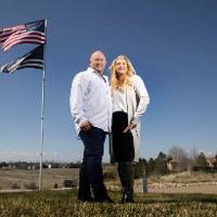 Jennifer and Tim Kohl poses for a photo in their front yard with the American flag and a thin blue line flag in Star, Idaho, on April 14, 2023. The couple recently moved to Idaho from the Los Angeles ...